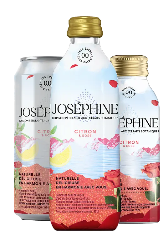 Joséphine’s bubbles and taste dance on your tongue, as only a lemon with a twist of rose can possibly do. Conceived in the French Alps, 100% natural, 0 calories in a recyclable bottle. Taste how good a good-for you can be.