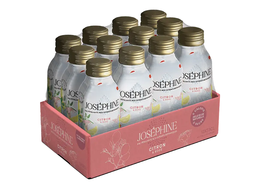 If you’re reading this, it’s because you’re interested in the content of what you’re drinking, and you’re right to be. Joséphine contains only sparkling water, real lemon extract and rose extract, known for its ancient botanical virtues. That’s all there is to it. It’s sourced in the Alps and we add only 100% natural ingredients. More than just a water, Joséphine is an experience, with refreshing bubbles bouncing off your taste buds in a perfect duo: the lemon has never been so well enhanced as by the rose. You’ll love your first sip, and all the others too. And when you’ve finished, recycle the bottle – that’s what it’s there for.